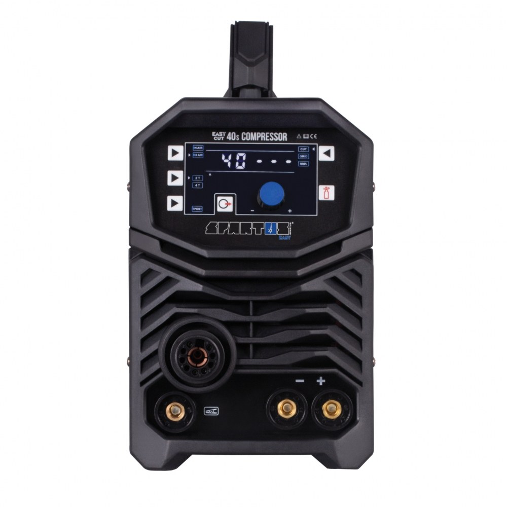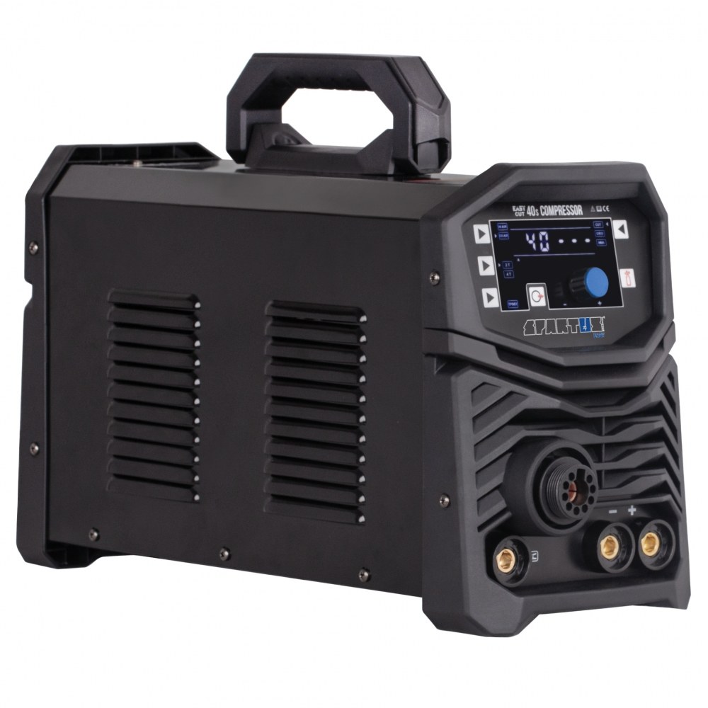 The SPARTUS® EasyCUT 40s Compressor is a compact inverter plasma cutter designed for cutting metals and other electrically conductive materials. It combines modern technologies with a lightweight and portable design, and is powered by a single-phase 230V network. The SPARTUS® EasyCUT 40s Compressor functions both as a plasma cutter and an electrode welding machine.