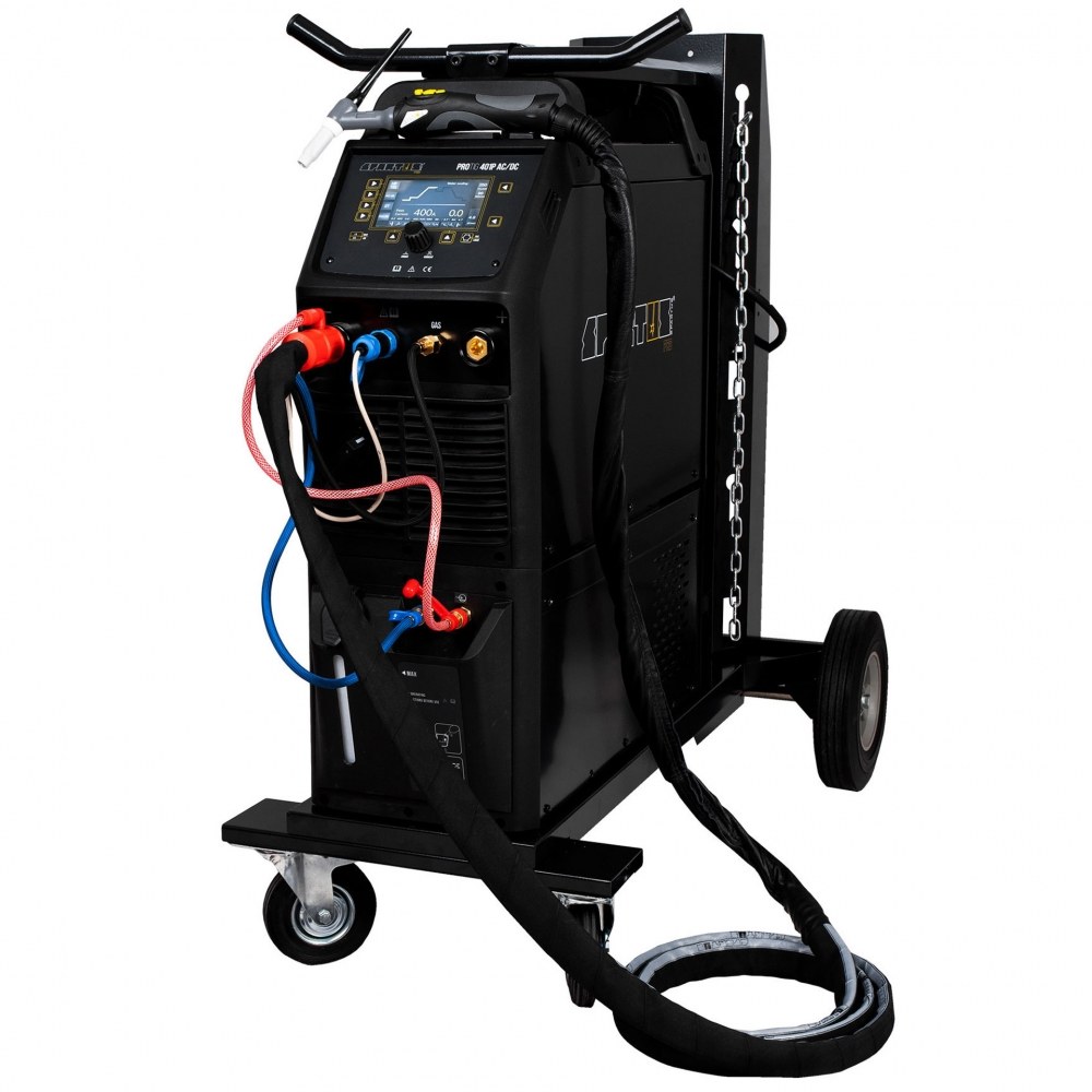 The ProTIG 401PW AC/DC model is additionally equipped with an integrated liquid cooler, whichensures efficient cooling of the torch during welding with high currents. The whole is placed ona transport cart with space for a shielding gas cylinder.