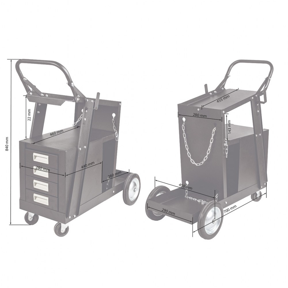 The SPARTUS® TR-110 is a mobile cart on wheels designed to ensure optimal organization in workshops. Equipped with two shelves, four drawers, and a dedicated space for a gas cylinder, it allows for convenient storage and transport of welding tools and other essential accessories. Its compact design ensures easy maneuverability, making it an excellent choice for welders who prioritize efficiency and safety at work.